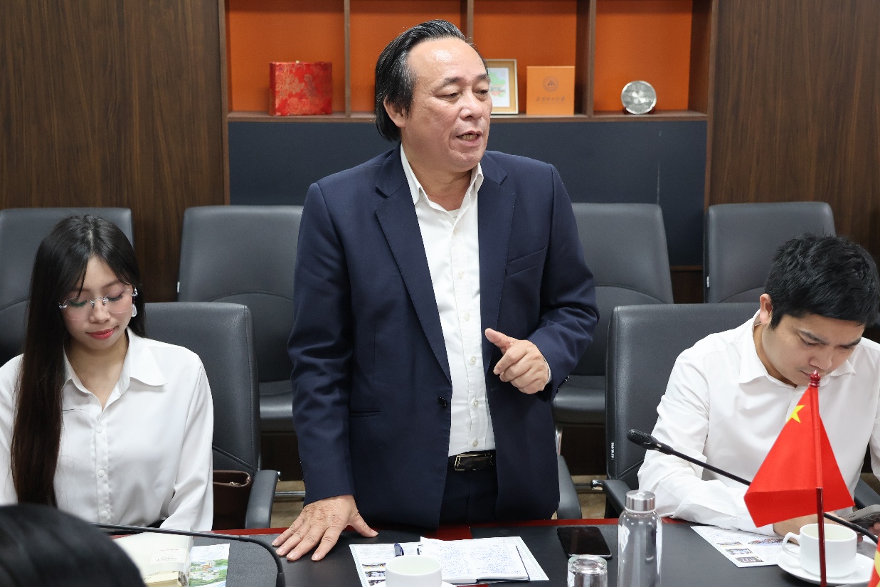 Prof. Dr. Hoang Van Sam – Director of International Cooperation Division reporting on the contents and results implemented between the University and partners, and contents to be deployed in the coming time, especially the upcoming signing of a cooperation MOU between the University and partners in China.